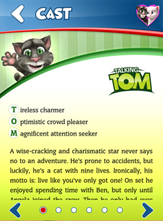 Talking Tom’s sunny persona and his passion for fun and adventure put him in the center of attention immediately. He's a larger-than-life type of guy. Or, as his friends like to put it, Tom is the "big ideas" guy. When he's not coming up with the next big idea that's sure to make him and his friends famous. He loves watching TV and movies, and sometimes even reading.